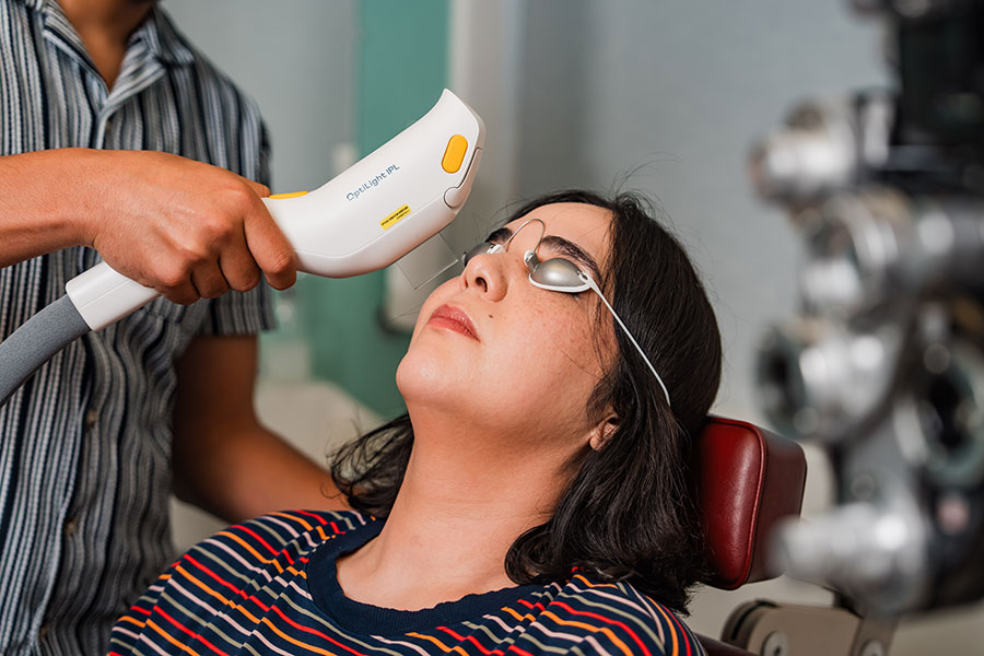 During your OptiLight treatment session, you will wear protective eyewear while we apply a cooling gel to the treatment area. We will then use the OptiLight device to deliver precise light pulses to your eyelids and surrounding skin. The procedure is quick, typically lasting around 15–20 minutes.